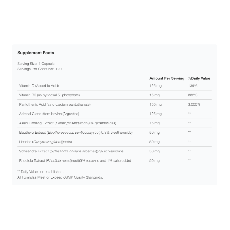 Adrenaliv® features a comprehensive blend of nutrients and botanical extracts targeted to supporting the body’s adaptogenic response to promote optimal energy production, stamina, and the management of everyday stressors. Adrenal glandular tissue, sourced from Argentinian bovine to safeguard purity, rounds out the ingredient profile.*
