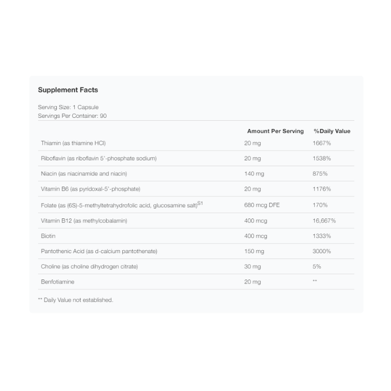 B Activ® contains the entire spectrum of B vitamins to support adrenal, neurological, and stress-related functions. It features activated forms of vitamins B2, B6, and B12; benfotiamine, a fat soluble, more physiologically active form of thiamin; and folate as Quatrefolic®, which is proven to have greater stability, solubility, and bioavailability over calcium salt forms of 5-MTHF.*
