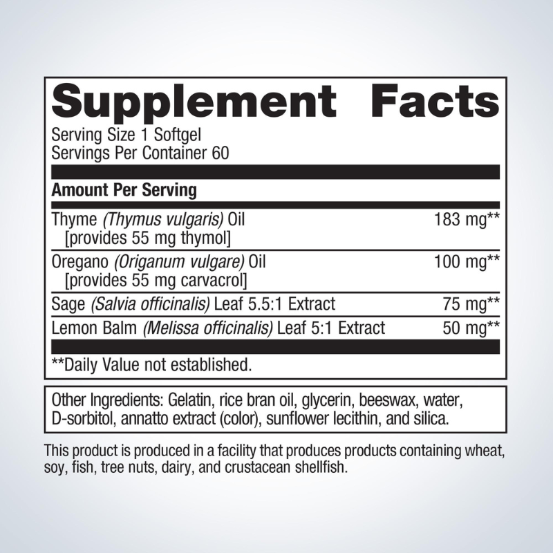 | Oregano (Origanum vulgare) Oil [provides 55 mg carvacrol] | 100 mg | * |