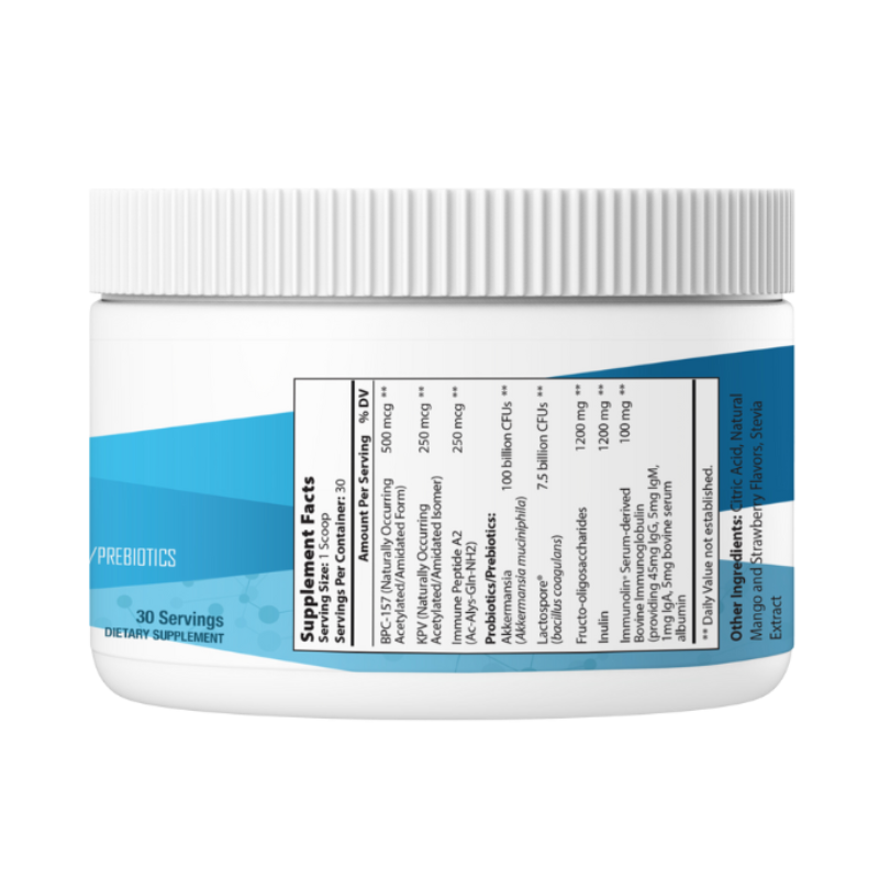 Introducing our newest ultimate gut-supporting drink blend — a thoughtfully formulated peptide supplement that blends naturally acetylated and amidated forms of BPC-157, KPV, and Immune Peptide A2 with a robust combination of probiotics and prebiotics, including Immunolin, Akkermansia, Lactospore, Inulin, and Fructo-oligosaccharides.