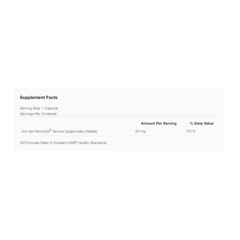 Iron bis-glycinate is a well-studied, 100% fully-reacted, patented form of iron exclusively from Albion® Laboratories. The amino acid glycine is actually one of the two starting materials the body uses to synthesize hemoglobin. Therefore, Iron Glycinate™ contributes two key factors. This form of iron has higher bioavailability, lower toxicity, less food reactivity, less food interactions and has a longer shelf life than any other common form of iron.*