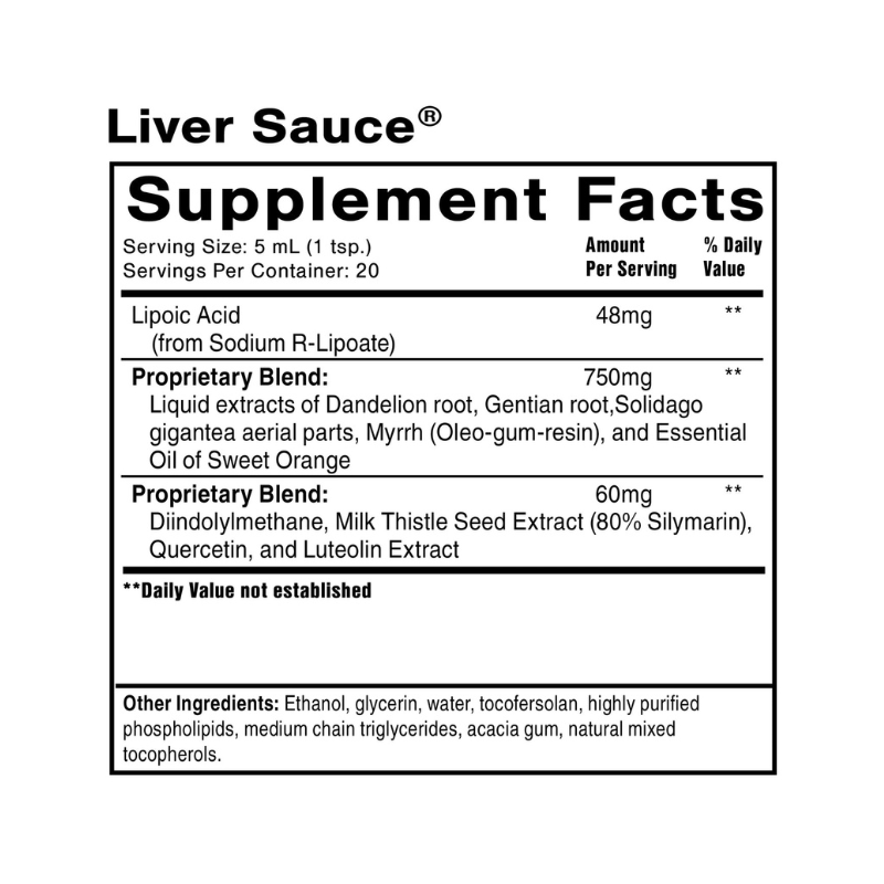 Dr. Shade’s Liver Sauce® is a patented, premium liver and detoxification support formula. This nanoformulated liquid blend features four potent bitter herbs (dandelion, gentian, goldenrod and myrrh) to aid bile fluidity and flow, along with powerful liver, detoxification, and immune regulating support from R-lipoic acid (RLA), milk thistle, diindolylmethane (DIM), quercetin, and luteolin.* Liver Sauce is one of the products in our patented PushCatch ® Liver Detox System and many of our other signature detoxification protocols.