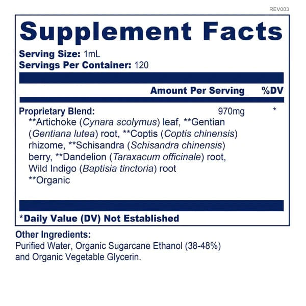 Ingredients: **Artichoke (Cynara scolymus) leaf, **Gentian (Gentiana lutea) root, **Coptis (Coptis chinensis) rhizome, **Schisandra (Schisandra chinensis) berry, **Dandelion (Taraxacum officinale) root, Wild Indigo (Baptisia tinctoria) root