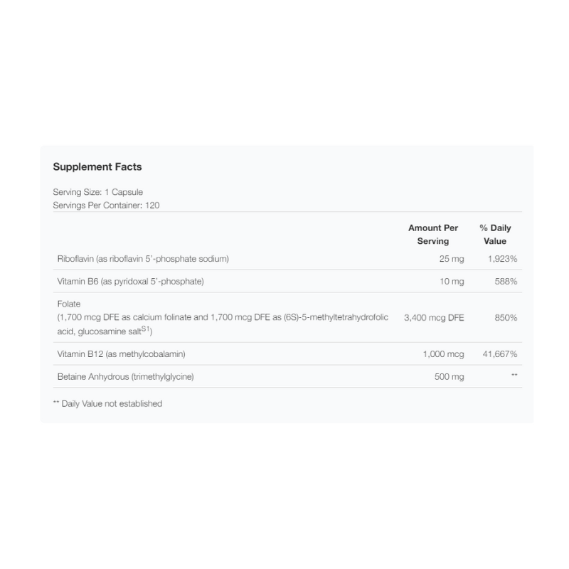 Methyl Protect® is a comprehensive formula designed to support optimal methylation and help maintain healthy homocysteine levels already within normal range. It features five key nutrients that are involved in homocysteine metabolism: folate as calcium folinate and Quatrefolic® for increased bioactivity; trimethylglycine; and vitamins B12, B6, and B2. These five nutrients, provided in activated forms, support enhanced methylation and overall cardiovascular health.*