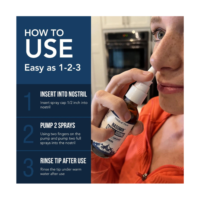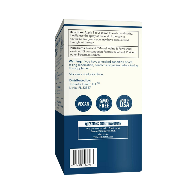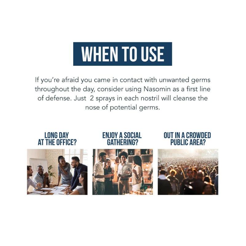 Come in contact with unwanted germs or pathogens? Nasomin can be used to neutralize germs in your nose to help prevent you from getting sick. A few sprays in your nasal cavity can eliminate unwanted germs that can grow into a cold or sickness. Nasomin is a natural mineral complex leveraging the natural sanitizing power of Iodine and Fulvic Acid.