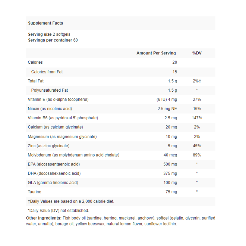 OmegaCo3-SE supports cardiovascular health and the immune system with a unique formula that includes 975 mg of IFOS™ certified omega-3 and omega-6 fatty acids (DHA 375 mg, EPA 500 mg, GLA 100 mg) per serving.* In addition, this formula incorporates essential cofactors, including, in each serving, 115 mg of targeted vitamins, minerals, and the amino acid taurine specially selected to support a normal balance of prostaglandin and leukotriene generation.* OmegaCo3-SE may also support neurological health, a healthy immune-response mechanism, antioxidant activity, and normal blood sugar balance in healthy individuals.‡* Also available in a 16 fl oz bottle (K7).