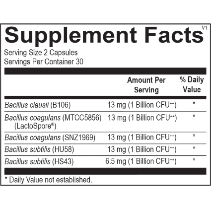 Ortho Spore Complete is specifically formulated with several spore-based probiotic strains to promote diversity and balance within the host gut microbiota. Each capsule provides key Bacillus strains that remain in a dormant, protective state in the harsh GI environment, then become active on target to transiently re-establish and recondition the gut to help prevent small intestinal bacterial overgrowth (SIBO) relapse.