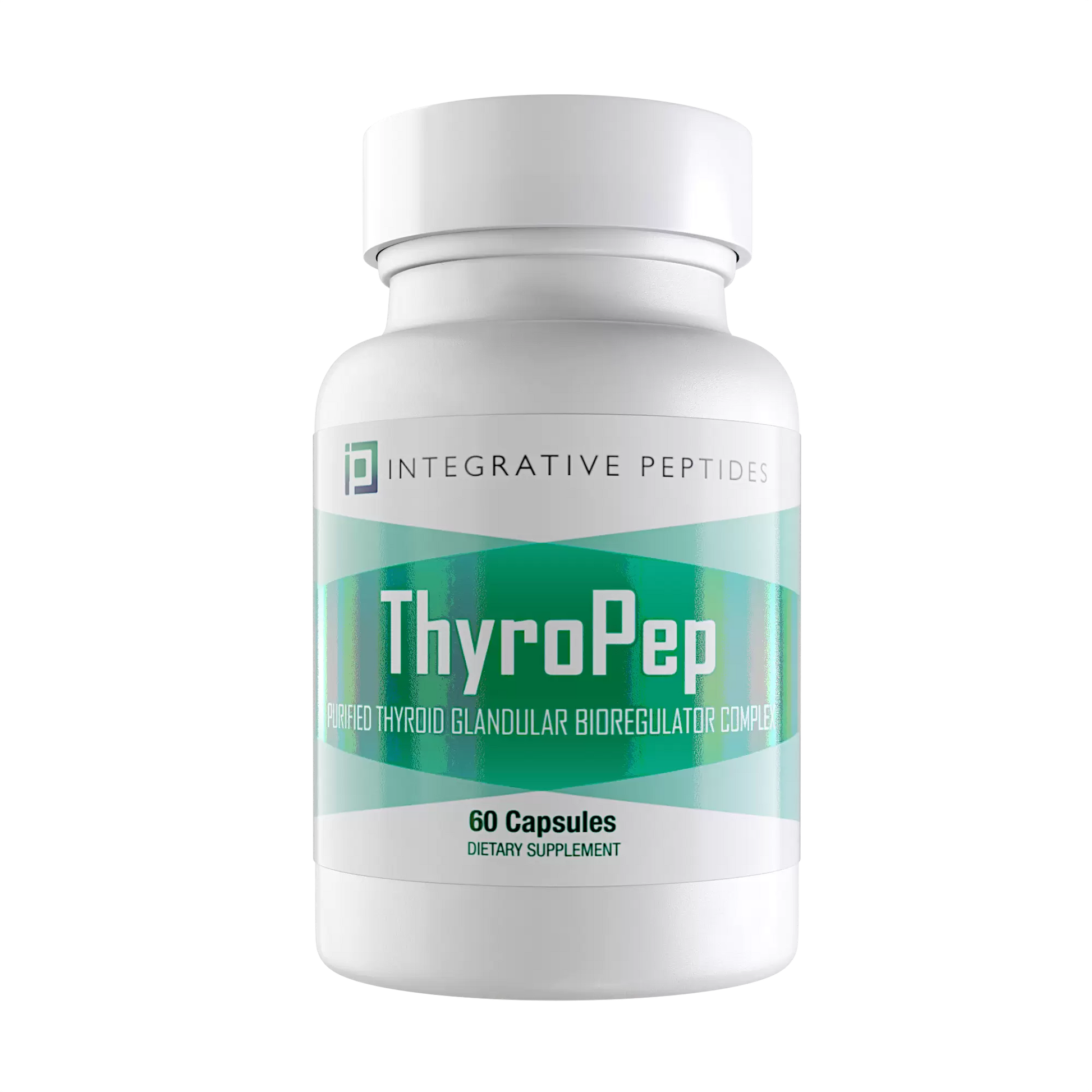 ThyroPep, a specialized supplement crafted to support thyroid health through a unique blend of peptide bioregulators and glandular extracts. This innovative formula features a Purified Bovine Thyroid Glandular Bioregulator Complex, specifically processed to exclude T4 and T3 hormones, allowing for natural thyroid support without direct hormone level alteration.