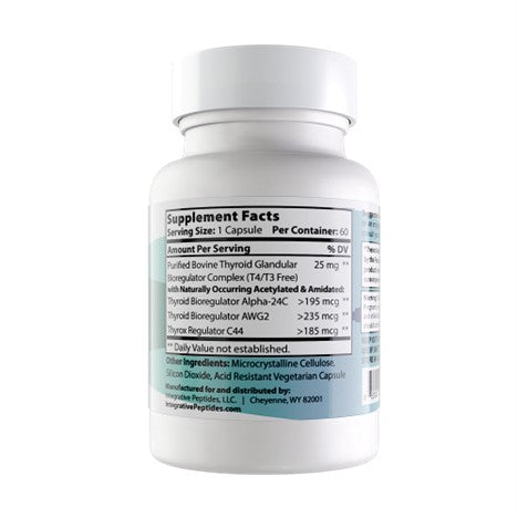 Purified Bovine Thyroid Glandular Bioregulator Complex (T4/T3 Free) 25mg with Naturally Occurring Acetylated & Amidated: Thyroid Bioregulator Alpha-24C >195 mcg, Thyroid Bioregulator AWG2 > 235 mcg, Thyroid Regulator C44 >185 mcg. Other Ingredients: Microcrystalline Cellulose, Silicon Dioxide, Acid Resistant Vegetarian Capsule.